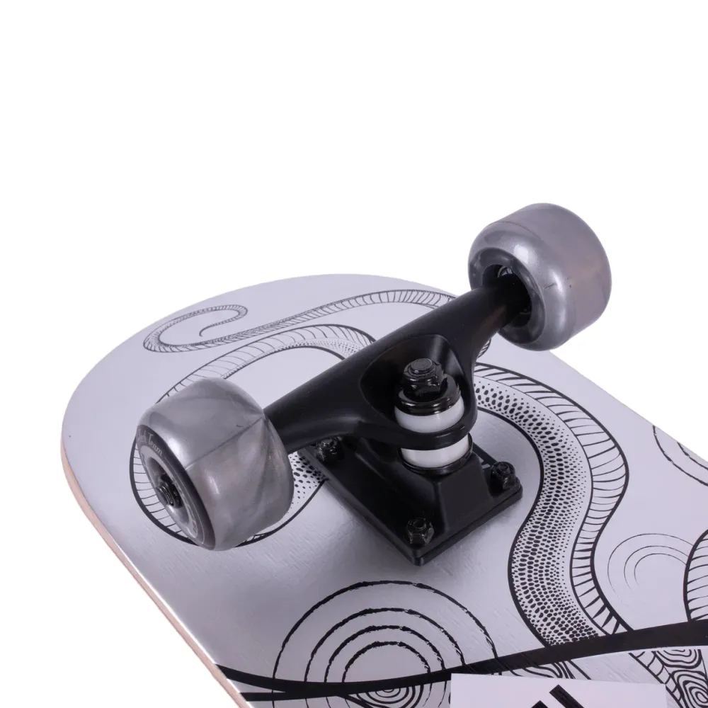 Нижняя часть деки украшена крутым принтом в серо-хромовом цвете со змеей, что подчеркивает бунтарский стиль Bad Boy. С этим скейтбордом вы точно привлечете внимание! Дека имеет двойной концевой загиб (Double Kick), что позволяет выполнять сложные трюки с легкостью.