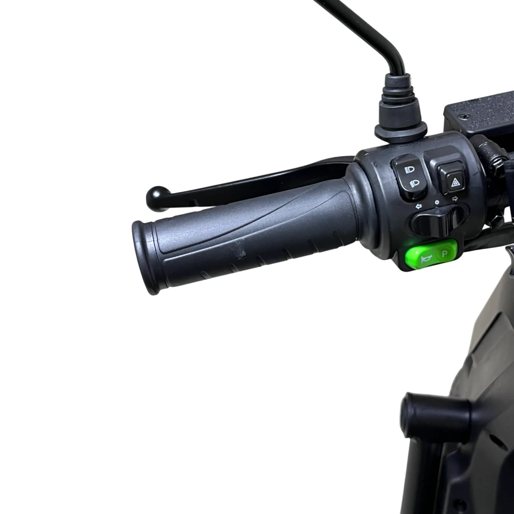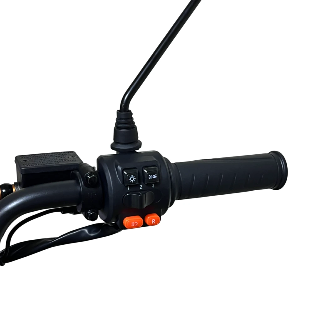Мощность двигателя 1500 Вт обеспечивает разгон до 60–70 км/ч, справляясь с подъемами до 20° даже при полной нагрузке (150–160 кг), но на неровностях или с пассажиром запас хода падает до 50–70 км. Двухподвесная система (передняя вилка + задние амортизаторы) гасит вибрации на асфальте и гравии; дисковые гидравлические тормоза останавливают за 3–5 м со 50 км/ч; Li-ion аккумулятор 60V 50 Ач с быстрой зарядкой за 8 ч дает реальный пробег 70–100 км в эко-режиме, 50 км в спорте. Три режима езды + задний ход оптимизируют энергоэффективность (эко экономит 20–30% заряда), мотоциклетная ручка газа упрощает контроль; подвеска и задний привод повышают эффективность на 10–15% по сравнению с передним.