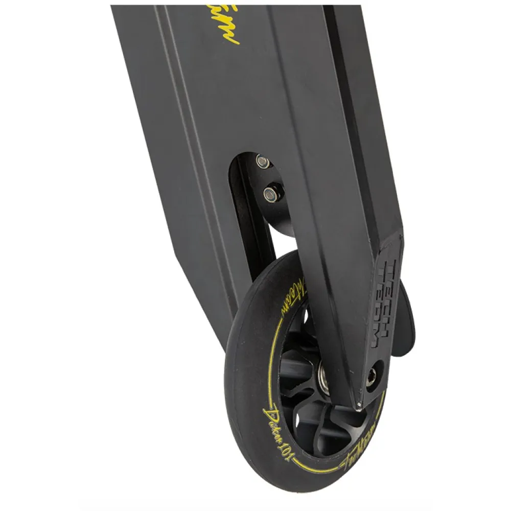 Трюковой самокат Techteam TT DUKER 101 2020 Черный - надежная и качественная модель для начинающих пользователей старше четырех лет. Производители использовали самые качественные материалы, чтобы обеспечить надежность и безопасность транспортного средства. Стальной руль высотой 58 см и шириной 50,5 см имеет надежное крепление системой HIC с зажимом на двух болтах. Стальная вилка также характеризуется высокой прочностью, получив при этом обновленную изящную форму. Полиуретановые колеса на алюминиевых дисках имеют оптимальный диаметр 110 мм и ширину 24 мм. Для данной модели производители предусмотрели качественные подшипники ABEC 9, которые гарантируют хороший накат и комфортный тихий ход. Алюминиевая дека с пластиковыми накладками на боковых гранях отличается высокой прочностью и выдерживает нагрузку до 100 кг. Ее поверхность покрыта мелкозернистой шкуркой, на которой нанесен рисунок с названием самоката. Противоскользящее покрытие позволяет райдеру сохранять устойчивое положение при выполнении различных элементов трюкового катания. Трюковой самокат Techteam TT DUKER 101 2020 сочетает в себе высокое качество материалов и сборки и стильный современный дизайн.