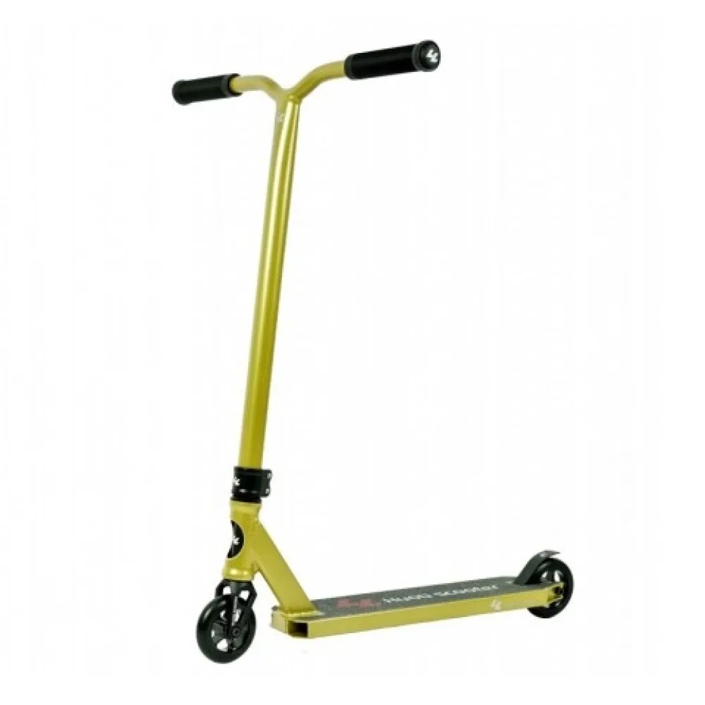Трюковой самокат Huoli Sand золотой выглядит презентабельно. Дизайн подчеркивает, модель создана для лидеров победителей, целеустремленных личностей, для которых первые позиции на соревнованиях занимают приоритетные цели.